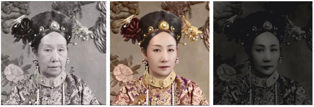 无处理照片中的你(左)、镜子中的你(中)和手机黑屏中的你(右) | 作者改编自慈禧皇太后光绪癸卯年照片之一及TR美术修复作品