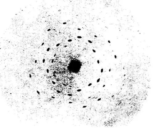 有个物理学家认为,X射线是电磁波。他设想,只要X射线的波长与晶体中原子(离子)之间的距离相接近,用X射线照射晶体时,就能观察到电磁波的干涉现象。在他的鼓励下,两个年轻人做了这个实验,于1912年获得成功:X射线穿过晶体发生干涉,在底片上形成规则的图案。这个解释了晶体微观规律的实验,被爱因斯坦誉为“最美的实验”。