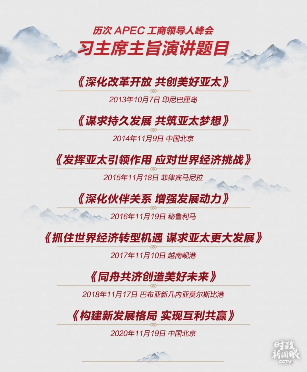 2017年5月14日,习主席在“一带一路”国际合作高峰论坛开幕式上提出,要将“一带一路”建成和平之路、繁荣之路、开放之路、创新之路、文明之路。在11月19日的主旨演讲中,他又提出了新的要求:要把“一带一路”打造成合作之路、健康之路、复苏之路、增长之路。2013年10月,首次亮相APEC领导人非正式会议的习近平主席就首次提出和描绘了“亚太命运共同体”路线图。他说,我们要牢固树立亚太命运共同体意识。去年11月,在巴西利亚出席金砖会晤时,习主席又鲜明提出,要致力于构建开放包容、创新增长、互联互通、合作共赢的亚太命运共同体。△7年前,在出席APEC巴厘岛会议期间,习近平主席首次提出要牢固树立亚太命运共同体意识。这是印尼巴厘岛的佩尼达岛。