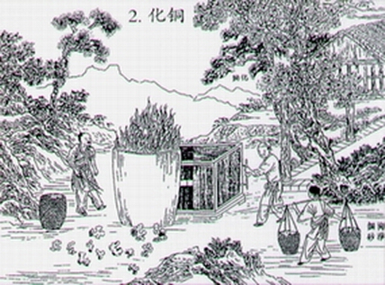 到了唐宋时期,湿法炼铜技术得到了比较广泛的应用。在文献中有关于“胆水浸铜法”的记载。这种方法的原理是把铁放在胆矾(硫酸铜)中浸泡,胆矾水和铁发生化学反应,前者的铜离子被铁置换成单质铜,得到沉积的铜单质。铜的这种冶炼方式成本相对较低,但需要有一定量的胆水,因此受季节、气候影响较大,在工业上大量应用的条件不够成熟。