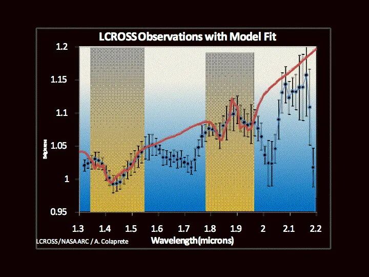 LCROSS观测数据,蓝色曲线为近红外光谱仪光谱曲线,红色曲线为月壤与水冰混合物光谱模型,两条曲线重叠明显,证明吸收特征是水冰引起(图片来源:参考文献10)