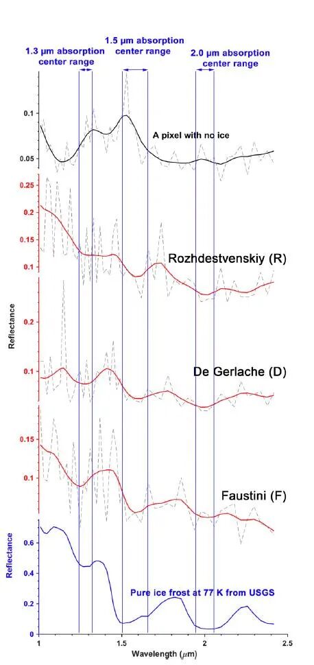 M3的探测数据表明,在全月都存在2.8~3.0μm的红外吸收特征,这些特征是由羟基(-OH)或水硅酸盐矿物引起的,但无法确定是否存在水分子。直到2018年,布朗大学李帅团队通过月球矿物光谱仪的观测数据在特定的波段范围内进行分析后,发现在月球南北极1.3μm、1.5μm和2μm的波段同时存在近红外光谱吸收峰,这是水冰存在的一个独特的特征,正是通过这三处特征吸收峰发现的这一直接证据,并经充分验证后,科学家们确定月球存在水冰。