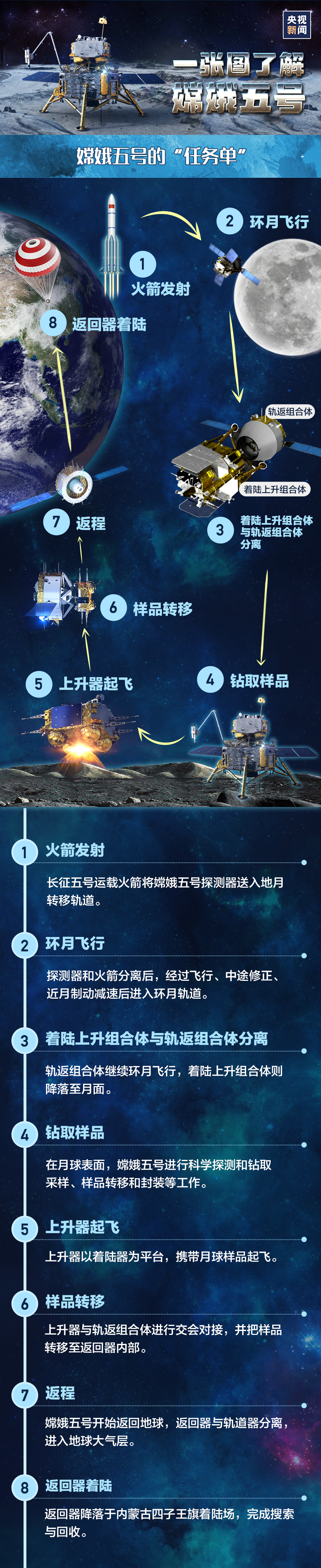 11月24日4时30分,我国在中国文昌航天发射场,用长征五号遥五运载火箭成功发射探月工程嫦娥五号探测器,顺利将探测器送入预定轨道,开启我国首次地外天体采样返回之旅。嫦娥五号从发射到落月需要经历怎样的过程?这一次,“嫦娥”将在月球上做些什么,又将如何从月球返回?跟随央视新闻的这张长图,一起揭秘↓↓↓监制/李浙 主编/蒋安琪总台央视记者/崔霞 李厦 徐静 李宁 陶嘉树 吴天白 吴娱制图/潘杨©央视新闻