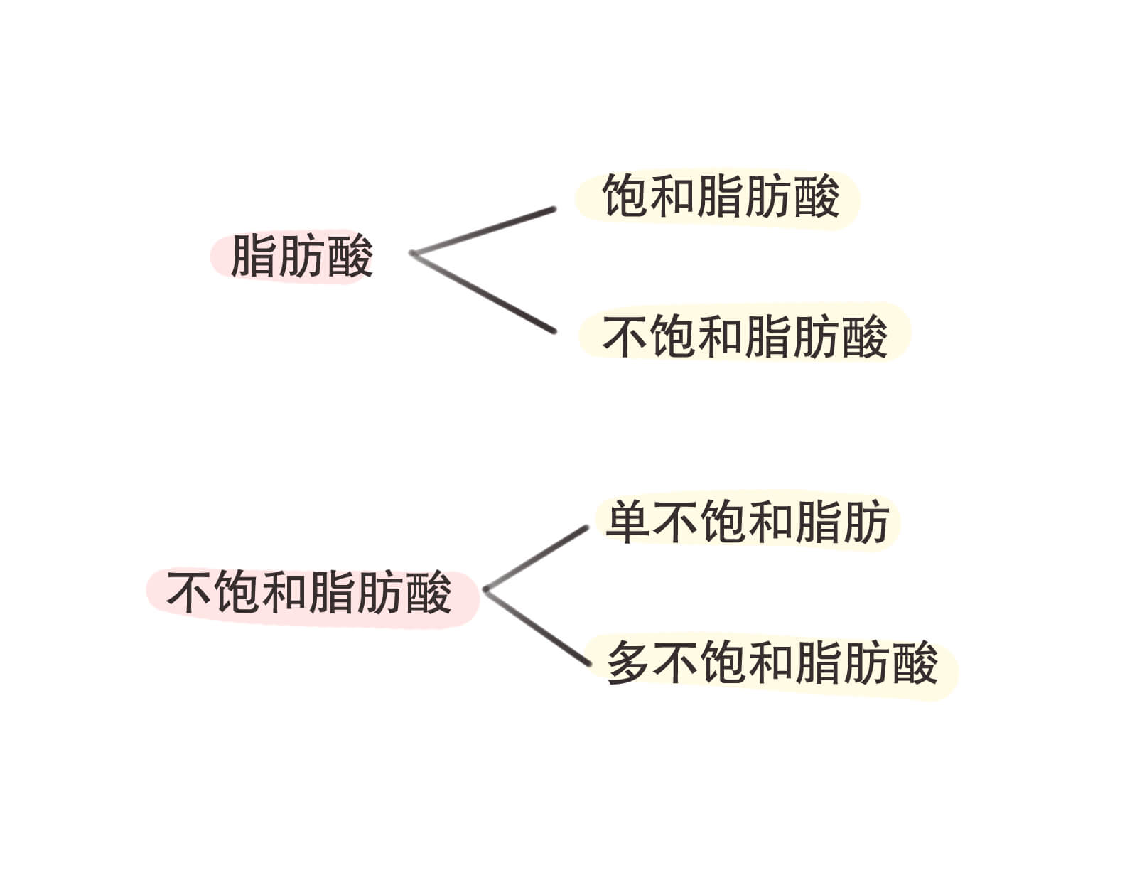 脂肪酸分为饱和脂肪酸、单不饱和脂肪酸、多不饱和脂肪酸。