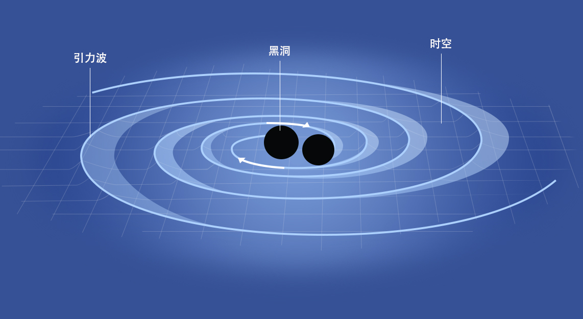 然而,我们却可以通过测量黑洞对周围天体的作用和影响,来间接观测或推测到它的存在。当两个黑洞互相影响,周围被弯曲的空间就会像水波一样振动,这种时空震荡,就是引力波。