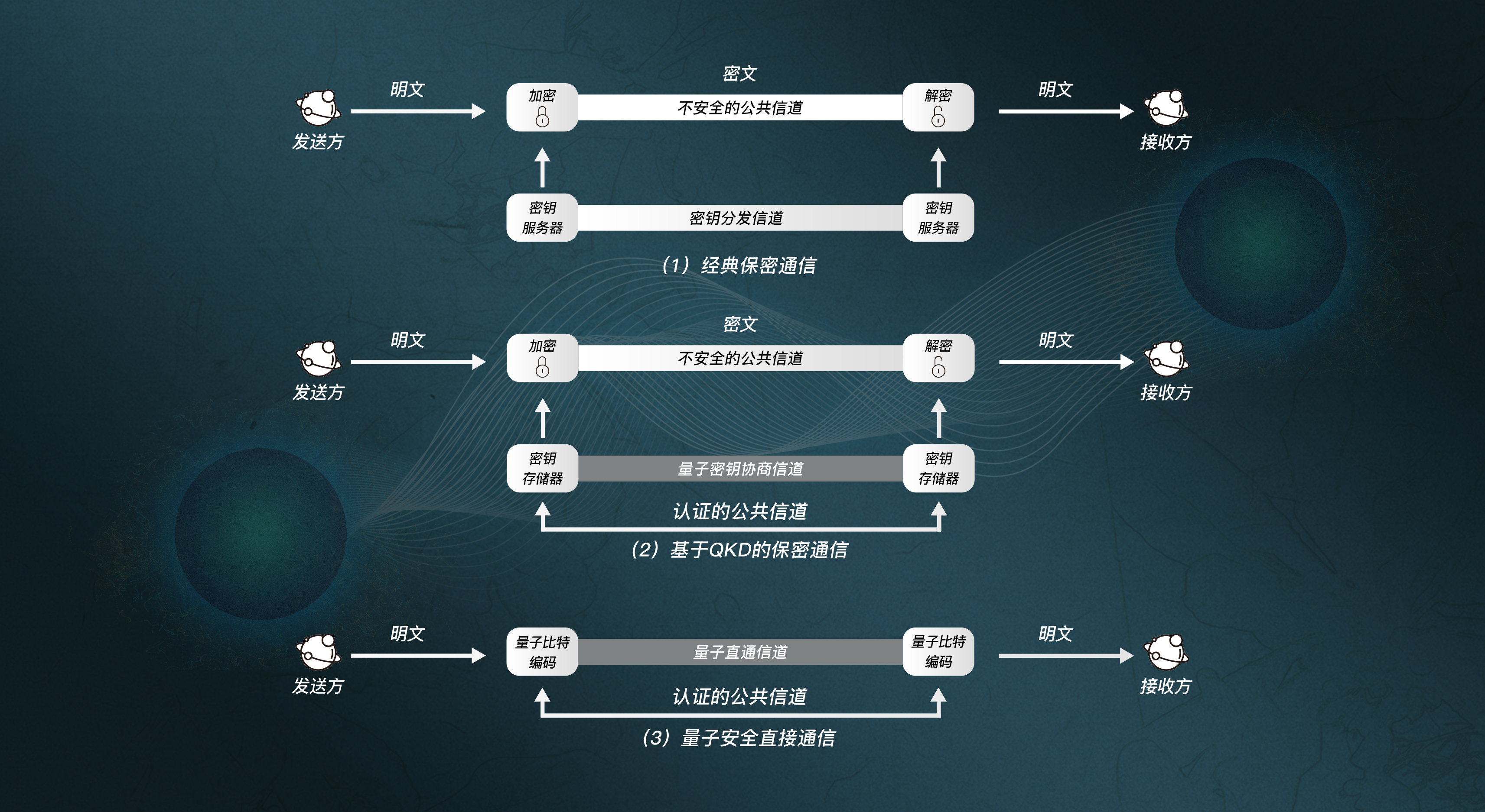 量子通信是基于量子力学的基本原理与特性的一种创新的通信方法。目前量子通信主要有三种形式:基于量子密钥分发(Quantum Key Distribution,QKD)的量子保密通信、量子间接通信(是对量子力学的纠缠特性的应用)和量子安全直接通信。其中基于QKD的量子保密通信发展最快,且已获得实际应用。