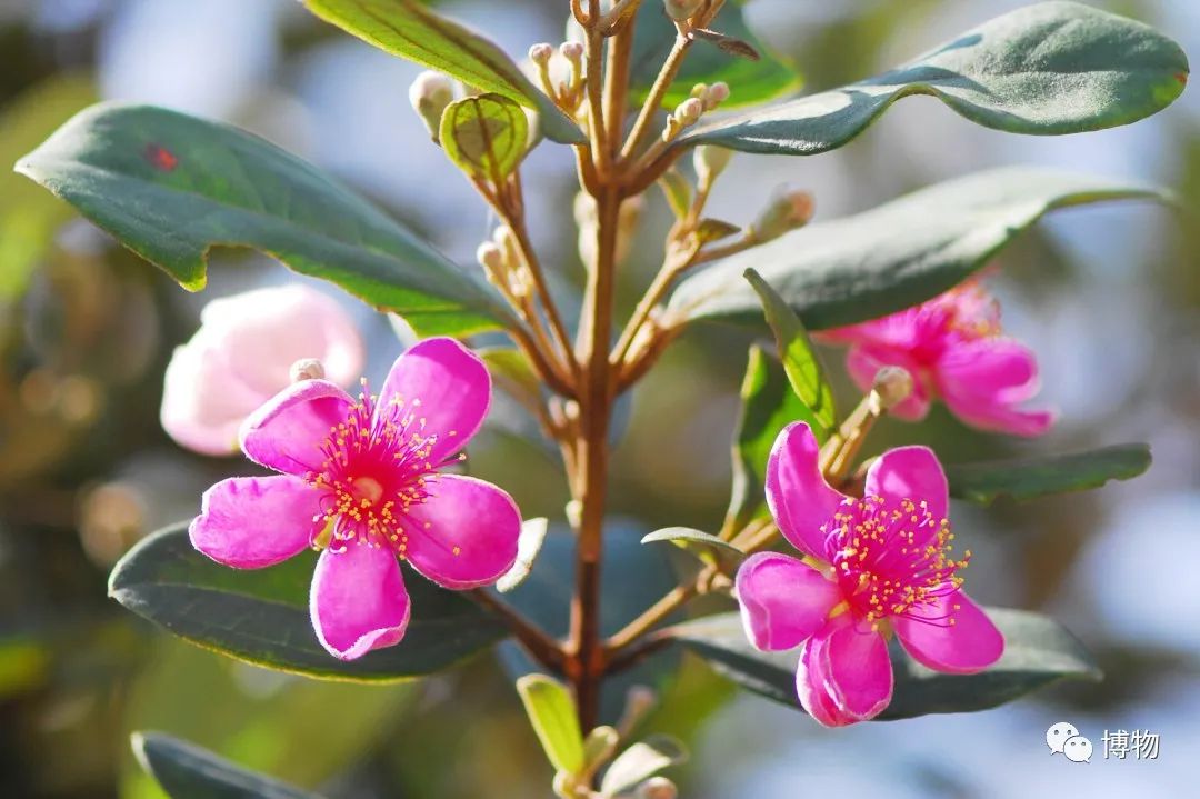 “有了!”只见他大手一挥,指向一株约有一人高的灌木,枝头挂着几朵残存的紫红色花,更多的则是小坛子状的紫色果子。果子我没见过,但那花我可认识,这不是南方常见的花卉“桃金娘”嘛!