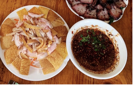 所谓生皮,就是半生不熟的猪皮,有时也包含新鲜的生猪肉,也被白族人称为“黑格”。杀猪是件大事,得挑好日子,新鲜的猪皮,去干净毛发,烧一把稻草,把去过毛的皮在火上烧一烧,切成片,生皮便做成了。这时,倒上当地白族自家酿的梅子醋,这种醋带有些许甜味,配上野花椒、煳辣子、麻籽、蒜蓉、姜末、白糖,做成梅子醋蘸水。猪肉和猪皮生腥,但碰上这特制的蘸料,不仅腥味儿去了大半,细嚼慢品,还有一种独特的肉香。生皮蘸梅子醋,便也成了当地人招待客人的特色佳肴。还有一种更方便的吃法,便是将制好的蘸水倾倒进盛满生皮的盘里,拌匀了再慢慢享用。