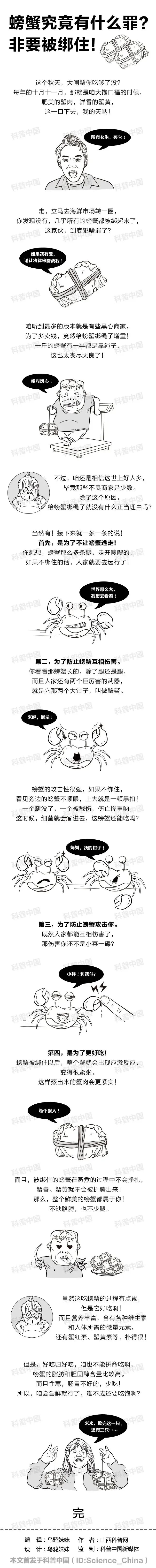 首先,是为了不让它们逃走。螃蟹可是有脚的动物,不管是把它放在水池中还是面盆中,它们都会逃跑,如果将它们绑住,就免去了“满地抓螃蟹”的麻烦。