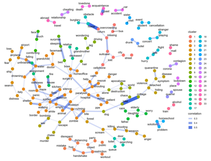 在这篇关于梦境的研究中,科学家们收集了在芬兰疫情封锁隔离的六周内4000多人的睡眠和压力数据,其中有800多人还提供了他们的一些梦境内容。科学家们利用人工智能技术(AI)对这800多人的梦境进行了分析,发现这些人的梦境可以归为33个梦境集群(Dream clusters)。其中有20个梦境集群是噩梦,在这些噩梦中又有55%含有与疫情相关的特定内容,比如社交疏离、病毒传染、个人防护和世界毁灭等主题。也就是说,在疫情蔓延的过程中,有很多人的梦境也被“感染”了。(研究者归纳出的33个梦境集群如上图所示,其中有22个梦境集群属于噩梦。)图片来源:Pesonen et al. 2020诸如模拟威胁理论(Threat simulation theory)和梦的连续性假说(Dream continuity hypothesis)等关于梦境的理论都一致认为梦境是现实的延续,尤其是发生在白天的一些负面事件会以另一种形式甚至是一模一样在梦里重复一遍。由于疫情给人们带来很多的焦虑,因此梦境被“感染”也就不足为奇了。认知神经科学的研究还表明,人睡着了,并不代表大脑也跟着一起“睡着了”。睡眠会激活一种离线处理的方式来加工最近的记忆内容,当人们进入快速眼动睡眠(REM sleep)时,就会开始做梦。在梦境中不仅有各种光怪陆离的事件发生,还夹带着情绪的唤起,人们可以在梦境中体验到与当前梦境事件相关的情绪。有研究表明,快速眼动睡眠在情绪处理方面有着很重要的作用,当人们做噩梦时,在引起情绪体验的同时,这些恐惧相关的梦境意象(Fear-related dream imagery)可以帮助消除这些令人不愉快的回忆。从这个角度来说,梦境就像黑夜中的守护神,默默清理着你那些不愉快的回忆。其实不只是今年的疫情,历史上也还有很多类似的重大危机事件,最典型的历史重大危机事件之一,是2001年美国的“911事件”,给美国造成的直接经济损失至少2000亿,并沉重打击了美国的航空、保险、金融和旅游业。这一系列的效应给美国民众造成了极大的心理影响,因此也有很多研究睡眠的心理学家从梦境的角度来研究这次恐怖事件对美国民众所造成的影响。有一篇发表在《睡眠》期刊上的论文研究了44位美国人的共计880个梦,其中一半的梦采集自“911事件”之前,一半的梦采集自“911事件”之后,对这些梦境进行对比分析之后,发现在“911事件”之后,人们的梦境中更多地出现“攻击”和“恐惧”等这些负面内容,同时这些梦境也比之前更加离奇,包含着更深刻的情绪体验。除了“911事件”的研究以外,在芬兰的一项大规模研究中,心理学家调查了近7万人在1972年到2007年之间的梦境,并对比了其中二战退伍军人和普通民众之间的梦境区别,发现即使过了几十年,二战退伍军人也比普通民众做的噩梦更多一些。可见这些重大危机事件对人们的影响是多么深远。心理学家Hartmann用当代梦论(Contemporary Theory of Dreaming)来解释这个现象,他认为人们平时内心的情绪是怎样的,晚上做梦的时候就会产生怎样的梦境意象,而且情绪越强烈,梦境中的体验也会更加强烈。例如内心很焦虑,就会梦到自己被追赶被袭击等情境,而且越是焦虑,在梦中就有可能会梦到越离奇的故事。对于亲身经历者而言,这些重大危机事件与人们平时也可能会经历的车祸、火灾和侵犯等事件一样,都属于“创伤事件”(Trauma event),当这些创伤事件对亲身经历者产生很大的影响,甚至影响了正常生活,就可以认为是产生了创伤后应激障碍(PTSD)。DSM-5(《精神疾病诊断与统计手册》第5版)对PTSD的定义中就包括睡眠困难和频繁噩梦等临床症状,但即使还没达到PTSD的临床标准,人们在亲身经历创伤事件后,其睡眠和梦境都会受到很大的影响,不仅容易失眠,还很容易做噩梦,而且这些梦境之间都有着一些内容上的关联,反映了亲身经历者共同的情绪和心境。很多研究表明,睡眠是众多心理健康问题的核心因素,而梦境属于睡眠的一部分,尽管偶尔的噩梦是无关紧要的,但频繁的噩梦则与睡眠困难、抑郁症状甚至是自杀倾向有着非常紧密的关系,对人们的心理健康有着很大的影响。因此心理学家发展出了一些专门应对创伤后噩梦的认知行为疗法,例如意象训练疗法(Imagery rehearsal therapy ,IRT)以及暴露、放松和重构疗法(Exposure, relaxation, and rescripting therapy ,ERRT),但这些疗法还没有得到大量的证据证明是否疗效显著,其中一个原因是因为这些疗法大部分时候只能治疗一些较轻的创伤后噩梦,对于较严重的创伤后噩梦则没有多大的疗效。对于较为严重的症状,临床上还会采用药物疗法,但这些药物疗法也有着很多副作用或者疗效有限等缺点,所以目前仍然还没有较为成熟的针对创伤后噩梦的治疗方法。关注自己的心理健康状况是非常重要的,尽管现在疫情管控情况良好,已经很少隔离了,但生活中仍然会发生各种各样的应激事件,如果有一段时间发现自己的噩梦频率有所上升,在不严重的情况下还可以采用一些自助疗法,例如倾诉、健康饮食和适当运动等方法,都可以改善睡眠质量,减少做噩梦的频率,预防产生心理障碍。参考文献: