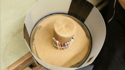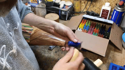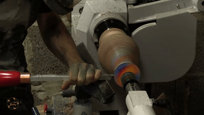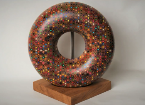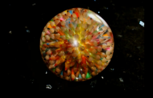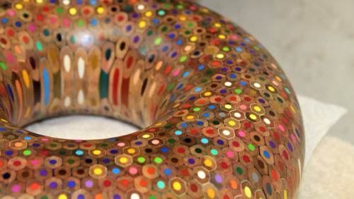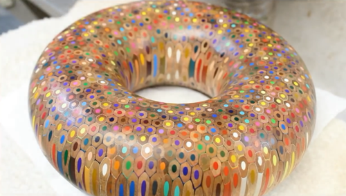 随着打磨,彩色的铅笔芯逐渐浮现,最后,涂好清漆,一个铅笔甜甜圈诞生。