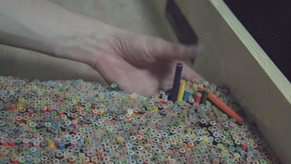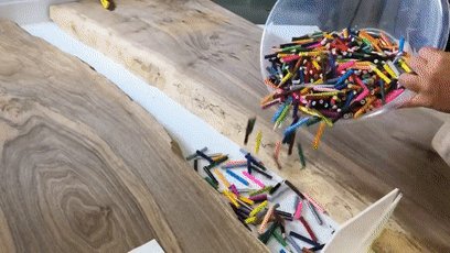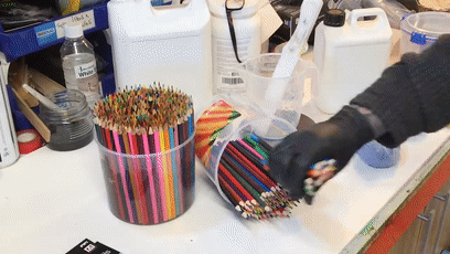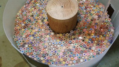 大功告成后,桌面上的「铅笔河」一路流淌,最后,溪流变成了桌子的两条腿,有点好看:不过最绝妙的还是下面这个创意:用无数铅笔组成一根蜡笔。