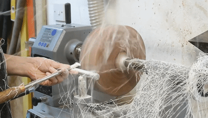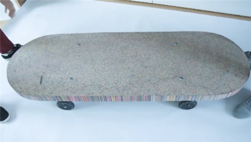 用机器压实之后,把铅笔木板切开,再将获得的小型木块两面都涂满胶,粘成螺旋体的形状。