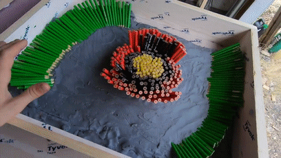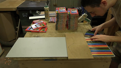 听着很迷惑,但制作过程简单易懂,正所谓羊毛出在羊身上,直接用几十盒铅笔堆积到一起,蜡笔的笔杆就这样完成了。