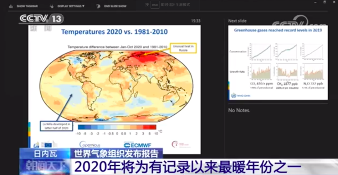 ●世界气象组织2日在日内瓦发布《2020年全球气候状况》临时报告指出,2020年将成为有记录以来最暖的三个年份之一。2020年海洋热量处在创纪录水平,全球80%以上的海洋均在某些时段经历了海洋热浪,对海洋生态系统产生了广泛影响。地球在未来几代人的时间里将进一步变暖。(来源:央视网)