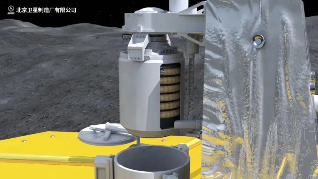 该系统装在嫦娥五号最顶端,由主体框架、密封容器组件、盖体组件和开合机构组件等组成。镂空的主体框架上分布着用于转移的棘齿和导向条,钛合金和铝合金材料能保证其结构强度和刚度,并最大限度减轻重量。