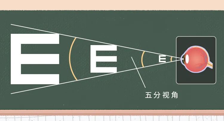 看整个字母“E“”,因为是5个小份整体看,所以与眼睛的夹角就是5分视角。↓ ↓