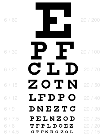 当我们站在视力表5米距离前能看清1.0-5.0排的“E”、站在50米处能看清第一行,也就是0.1-4.0排的“E”,视力就是不需要矫正的(视力非常棒),如果存在近视或者远视,也是以矫正到这个程度为标准;