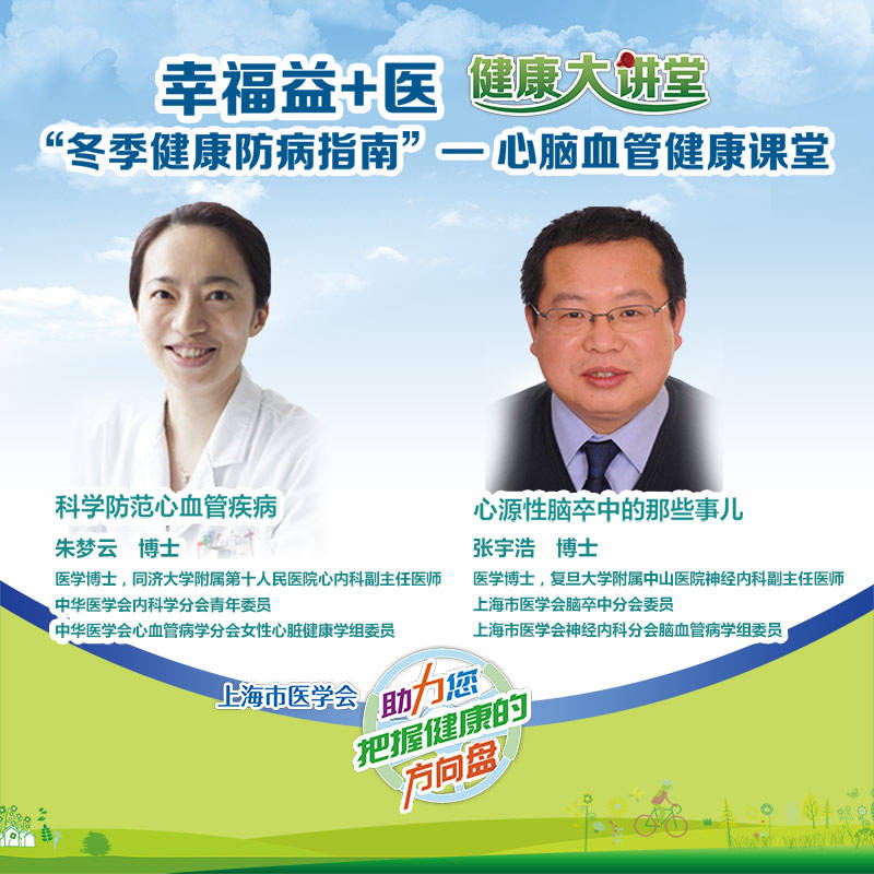 12月8日下午14:00,我们邀请到上海市医学会心血管病分会和脑卒中分会的两位专家,第十人民医院心内科朱梦云教授和中山医院神经内科张宇浩教授,给大家讲讲冬季心脑血管疾病的防治指南。让我们一起听听专业的讲解,培养一个健康的生活习惯,让心脑心管病远离我们所爱的亲人。