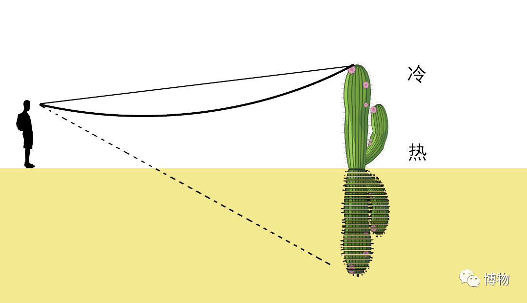 旅行者常在沙漠中看到远处有湖水,水中有沙丘的倒影,跑过去一看,啥也没有。这就是下现蜃景,那湖水,其实是天空的倒像。沙丘的倒像也呈现在本体的下方,貌似水中的倒影。