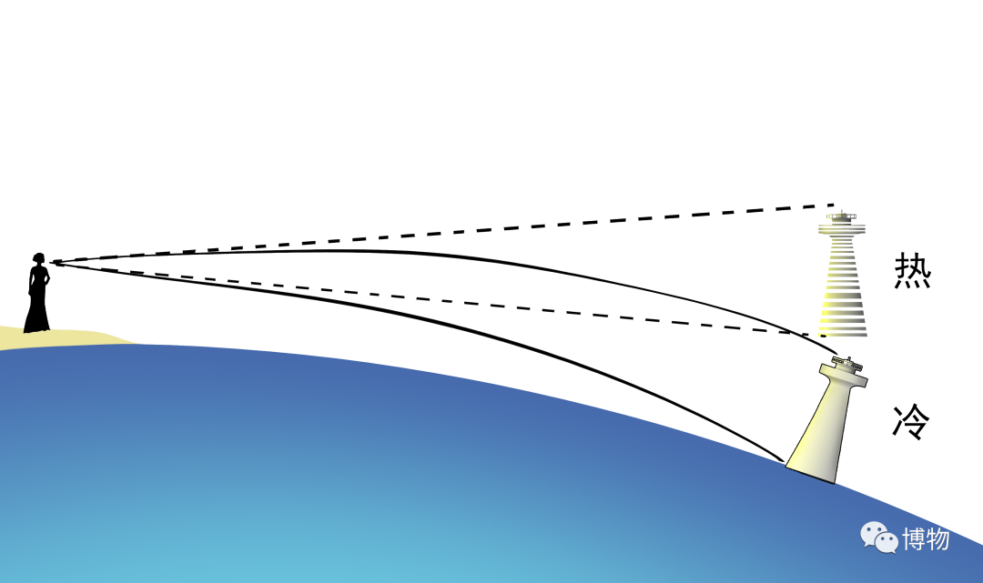 海上出现的,大多是上现蜃景。春夏之交,大海还比较冷,导致它表面的低层空气也冷,但高层已经有暖空气袭来,下冷上热,上下的空气密度不同,使光线发生折射,让远处物体的图像显现在实际位置的上方。于是,我们看到了远在地平线以下、本应看不到的物体。