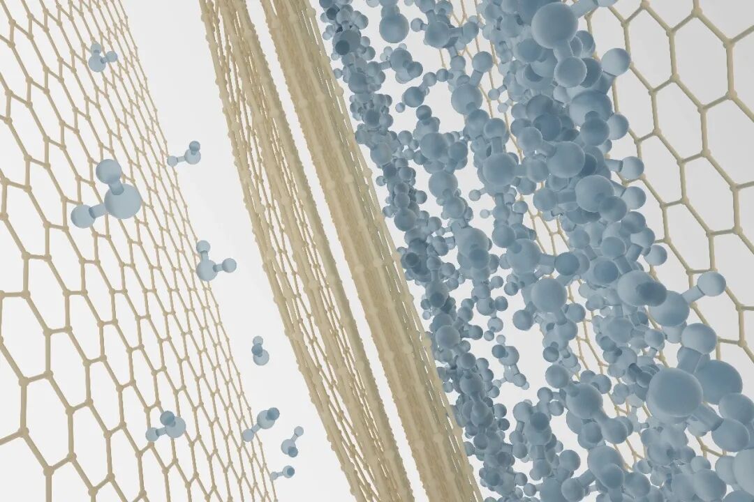 水分子(红色)在石墨烯通道(灰色)内发生凝聚后,通道的变形消失。