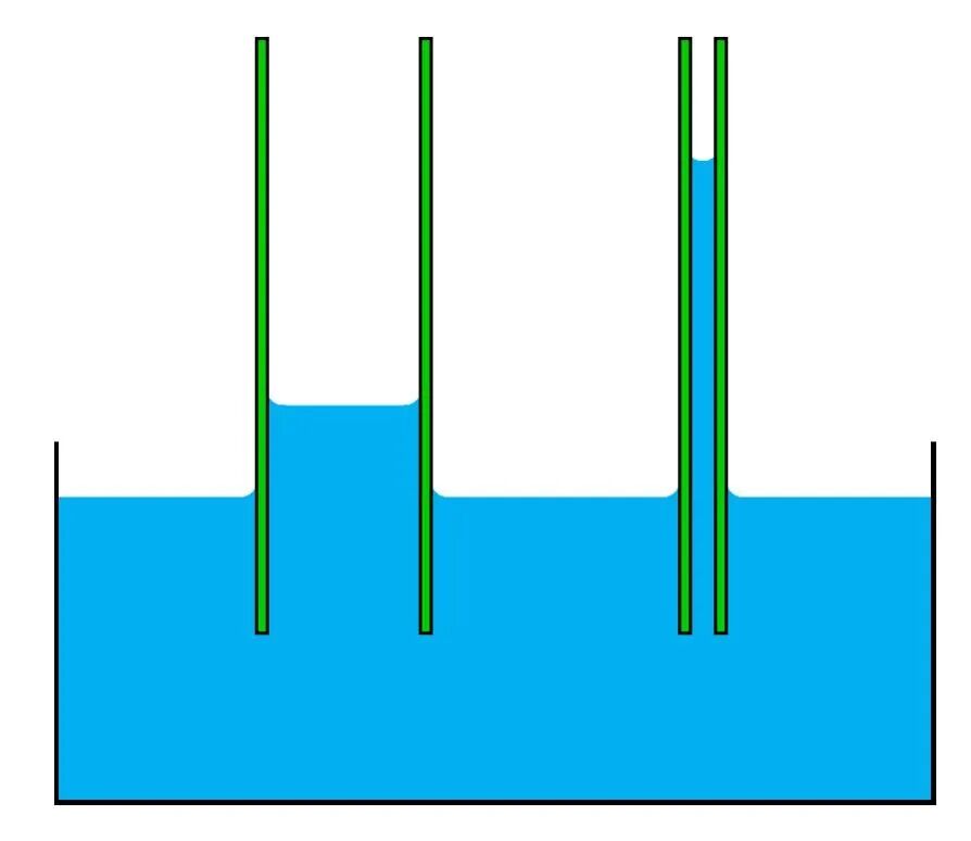 对一杯水而言,弯曲界面的范围太小,几乎不会影响到水的性质,可以把水面当成平的来处理;但是当系统变小时,就会有很多有意思的事情发生。比如无处不在的毛细现象:浸润液体会在细管道内自发地向上爬升。钢笔的笔尖利用毛细作用引导墨水。植物能生长也得益于毛细现象:土壤中的孔隙形成了天然的毛细管道,地下水顺着这些管道向上爬,才能被植物的根系所吸收;植物体内的导管也是毛细通道,将水逆着重力向上运输,让水参与植物的光合作用等生命活动。再比如,上面所说的毛细凝聚现象。
