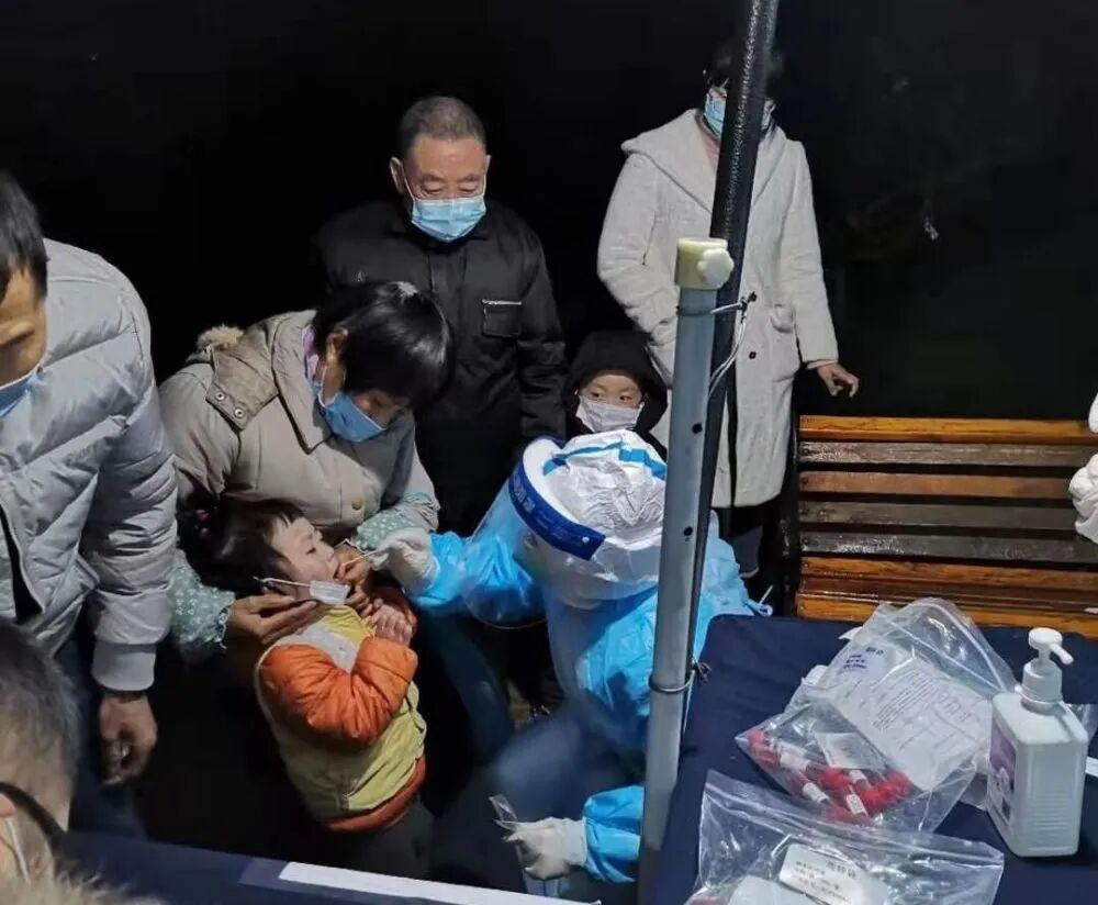 余娟(穿防护服者)为自己的孩子做核酸检测。
