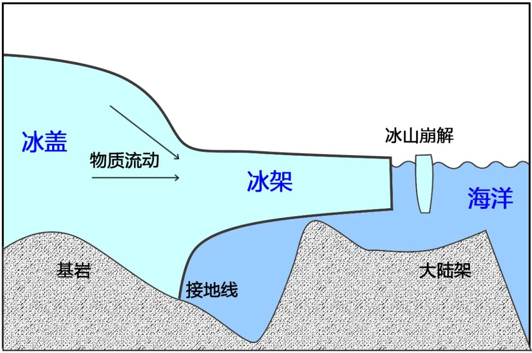 南极洲98%的表面被冰雪覆盖,其冰盖的冰储量占了全球总冰量的90%——北极格陵兰冰盖仅占9%——将近世界淡水资源的70%。但这广阔极地的冰盖在下个世纪可能会销声匿迹。2020年9月23日一项发表在《自然》杂志上的研究揭示,如果全球变暖不加以遏制的话,南极洲很快会走上一条“不归路”,该大陆上覆盖了3000多万年的冰雪将荡然无存。研究人员利用计算机模拟了温室气体排放对全球平均气温以及对未来南极洲样貌的决定性影响。他们发现,如果全球平均温度比工业化前的水平上升4℃,并持续一段时间,南极洲西部的大部分冰架将会碎裂,全球海平面将上升6.5 米。——如此高的涨幅将摧毁纽约、东京和伦敦等沿海城市。这并非危言耸听,这种情况可能在几十年内成为现实。联合国政府间气候变化专门委员会(IPCC)曾推测,如果允许目前的温室气体排放水平持续到2100年,全球平均气温将上升5℃。如果温室气体排放水平增加,情况可能会变得更糟:在未来几千年的任何一段持续时间内,全球气温如若比工业化前的水平上升6至9℃,那么南极洲现在70%以上的冰将不可逆转地消失。更有甚者,如果气温上升10℃,欧洲大陆也注定成为全年无冰的大陆[1]。其实早在2019年,就有研究指出,南极洲西部的许多冰架(即陆地冰延伸到海洋的部分)正在经历失控的融化,该地区大约25%的冰有坍塌的危险[2]。2020年10月6日发表在《美国科学院院报》上的一项研究再次强调南极冰架的基础正在变弱。冰架示意图。冰架是陆地冰体在重力驱动下的产物,由冰体不断从接地线向海洋方向流动形成。冰架崩解会形成冰山。冰架是冰盖与海洋相互作用的主要界面,其稳定性很大程度决定了冰盖的稳定性。|编辑制图