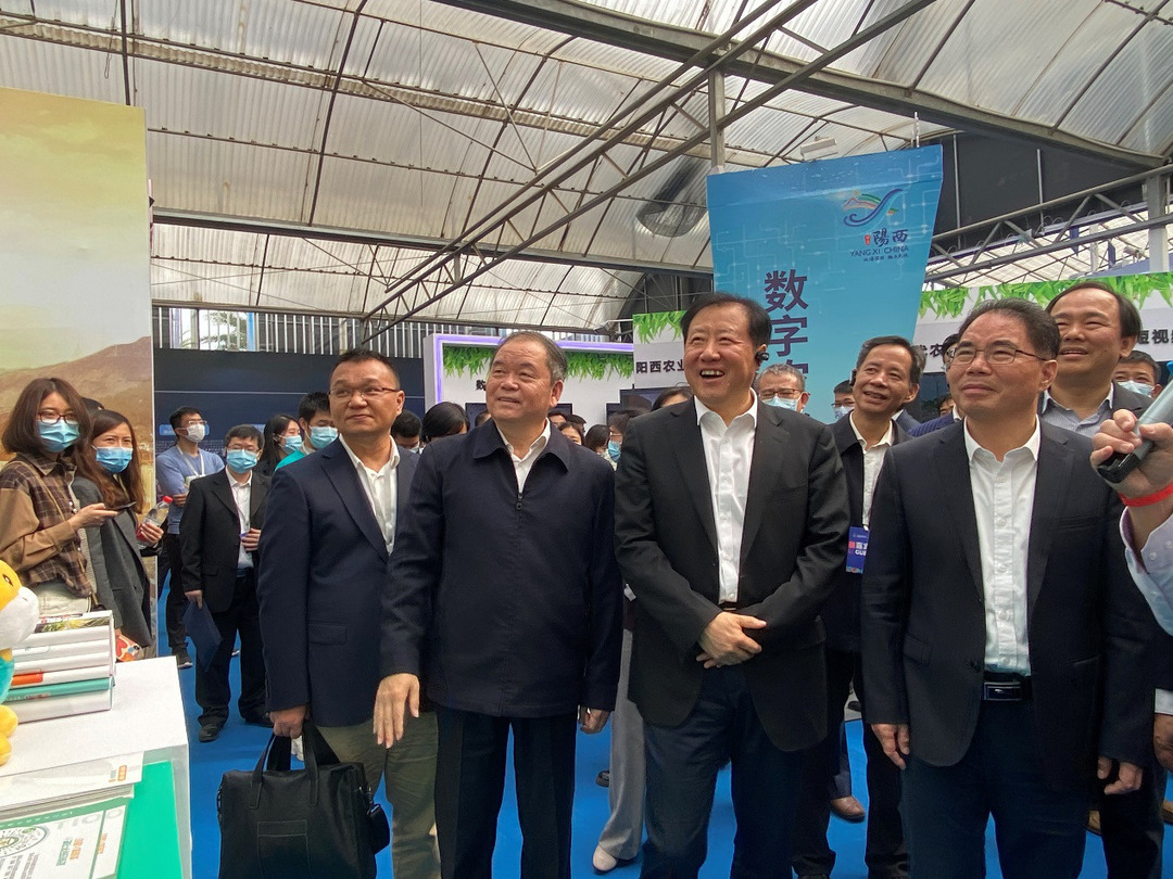广东省委常委叶贞琴(右一)、农业农村部总农艺师广德福(右二)、广东省人大常委会副主任黄业斌(左二)、拼多多副总裁韩东原(左一)等参观世界数字农业大会。