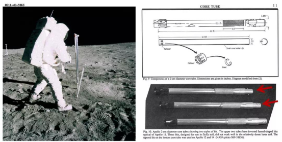 (右)阿波罗11号使用的采样管长这样(红色箭头) | NASA
