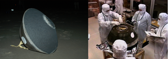 (右)星尘号返回舱在犹他州迈克尔陆军机场的临时洁净室中被打开,样品收集装置随后被重新封装运往休斯顿的约翰逊航天中心 | NASA