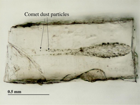 星尘号收集样品的气凝胶切片中采集到的彗星尘埃(箭头处)| NASA
