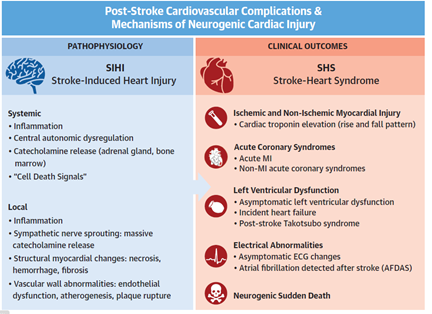 JACC杂志发表的一篇文章指出,脑卒中可引起的心脏损伤(SIHI),通过导致自主神经失调和强烈的持续炎症,引发“完美风暴”,可被归类为卒中-心脏综合征(SHS)。