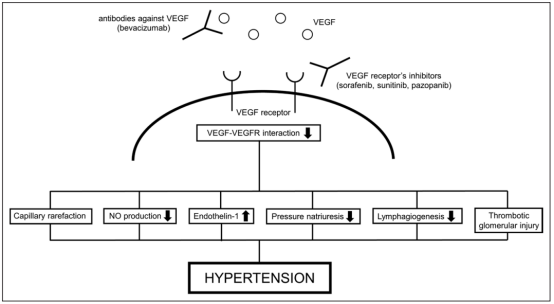 VEGF信号通路抑制剂相关高血压的机制包括:减少一氧化氮含量,内皮素-1上调,盐敏感性增加和肾损伤。