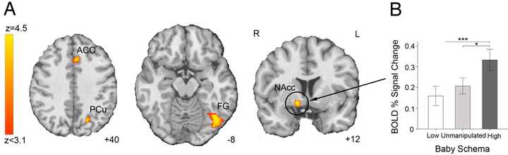 成年人大脑对可爱的婴儿形态激活程度更高,这种反应说明了,可爱真是无法抗拒呀。
