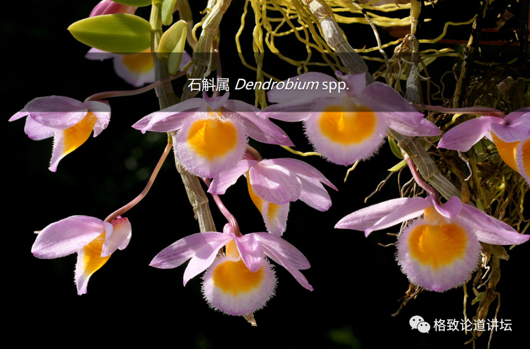 兰科下面有一个叫石斛属的,这个属都是一些附生的兰花,它们生活在大树或者是岩石上,花开得非常漂亮。
