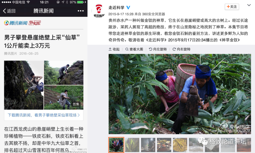 但是,与此同时,我们可以看到在很多社交媒体,甚至是在主流的新闻媒体上,还能看到男子悬崖绝壁上采仙草,一公斤能卖上3万元的报道。