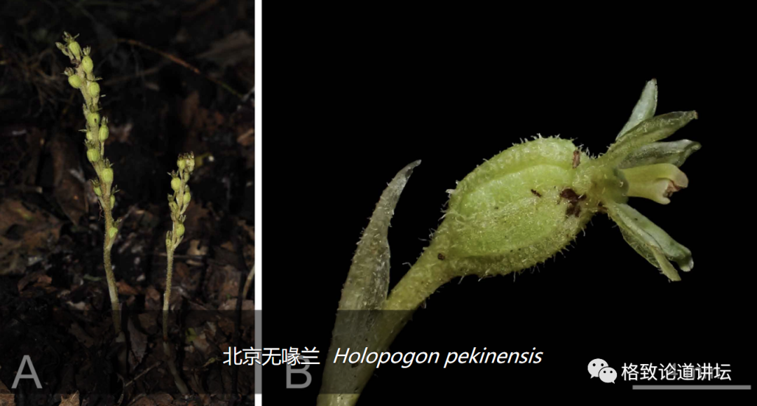 这种植物,叫做北京无喙兰,这是这几年刚刚发表的一个新的物种,它生活在北京周围离市区很近的一些山区里面,数量也很少。