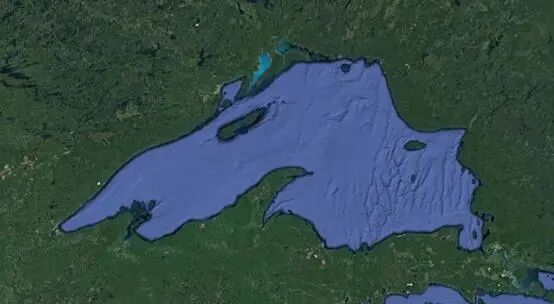 苏必利尔湖面积为82100 km2,体积为12232 km3,最大深度为406m。苏必利尔湖被加拿大的安大略省与美国的明尼苏达州、威斯康星州和密歇根州所环绕。