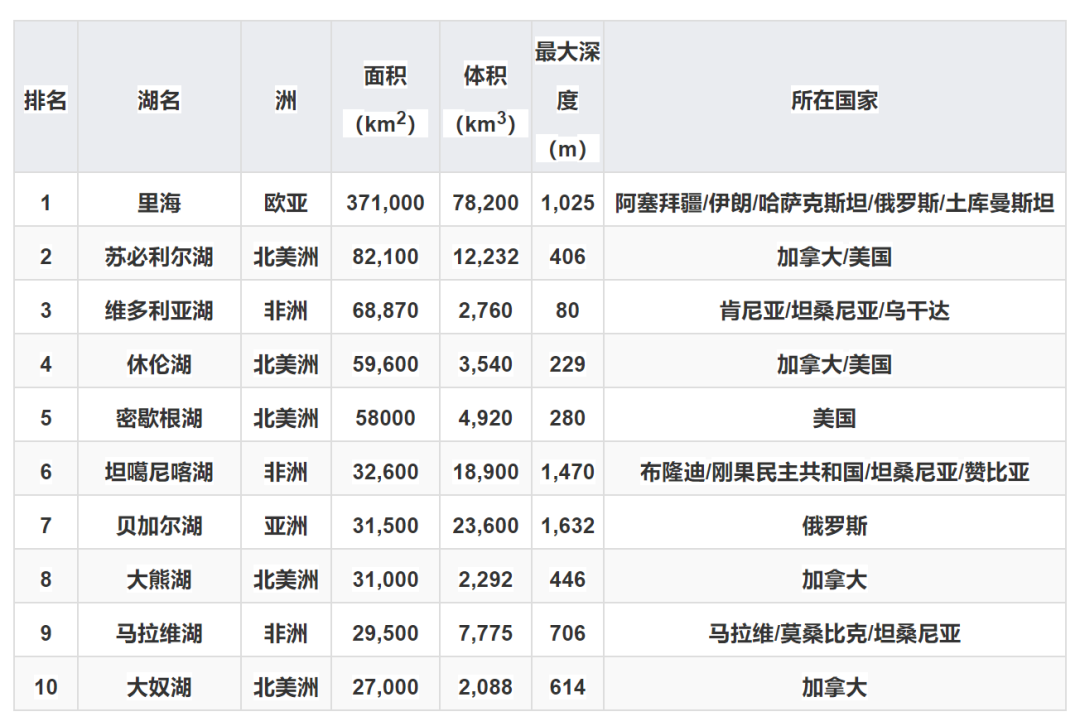 依据面积计算排名,全球前十的湖泊依次为里海、苏必利尔湖、维多利亚湖、休伦湖、密歇根湖、坦噶尼喀湖、贝加尔湖、大熊湖、马拉维湖以及大奴湖。