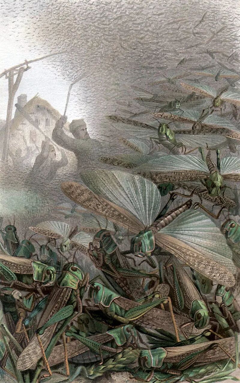 希尔德连续5天观察到1.6公里高的蝗虫群掠过头顶,像暴风雪一样遮蔽了阳光,声音像潮汐一样在地面翻滚。