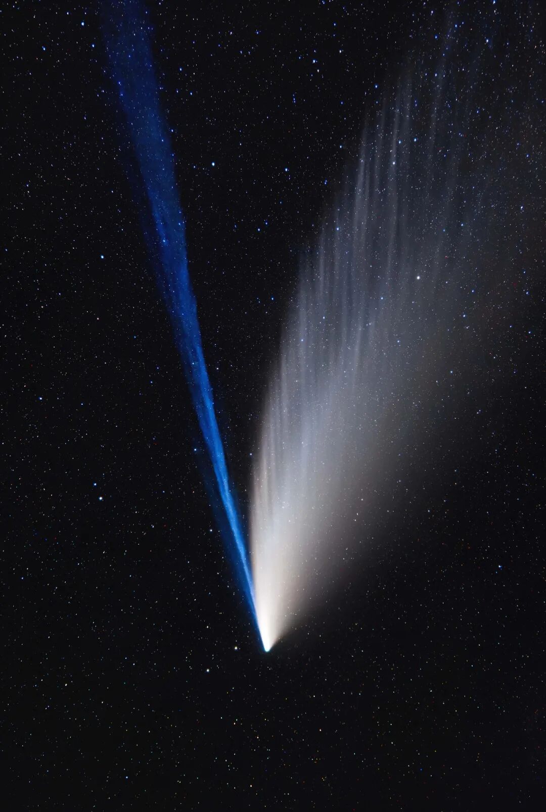 彗星扫过北方天空,展现出长长的彗尾。浅色的尘埃彗尾呈现宽大的弧形,与之分离的蓝色彗尾,是由彗发中物质被太阳风的磁场拖曳出来所形成的离子尾,在阳光作用下发出了荧光。版权/林子轩