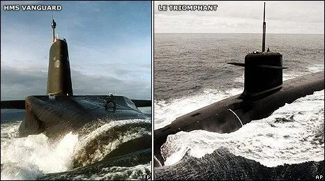 英国前卫号战略导弹核潜艇(左)和法国凯旋级核潜艇(右)。图片来源:BBC