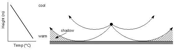 你可以看到,声波向声速更小的区域,也就是向上弯折了,而靠近地面的一些地方就产生了声影区。声影区里的人显然听不到声源发出的声音。