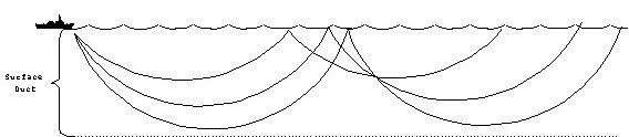 由于靠近海面的地方,声速随着深度增加而略有上升,因此在这里声波倾向于向水面弯折,画成图是这样的——