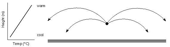 空气中声速和气温成正比(声速 =331 + 0.6×温度)。在夏日的白天,地面温度最高,那里的声速也最大。离地面越远,声速越小。所以在白天,声音的传播是这样的——