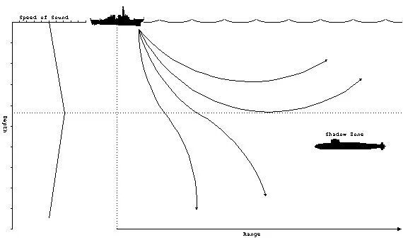 实际上在水下,声音并不像我们想象的那样,像阳光一样往四面八方发射。在海水中,声音的传播被限制在了一些特定区域中,而一些区域是声音无法到达的,它们就是声影区。利用这些区域,潜艇就可以玩失踪。