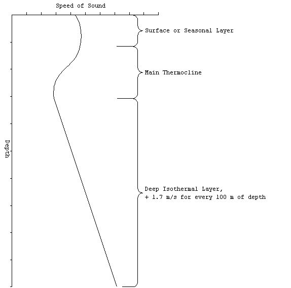 声速随深度变化的声速剖面图(横坐标是声速,纵坐标是深度)。图片来源:fas.org