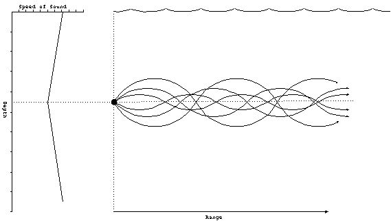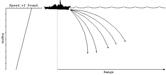然而在更深的水域,声速随着深度增加而减少,因此声波倾向于向下弯折。